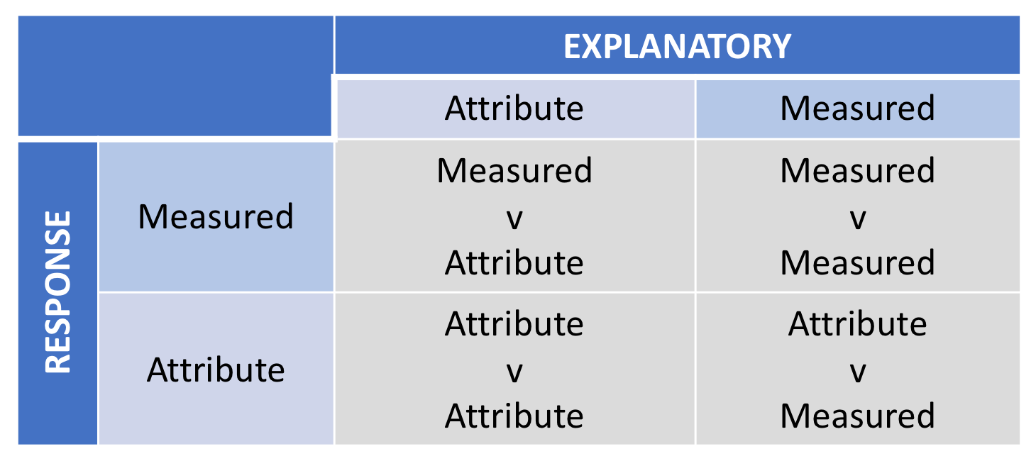 In general there are four different combinations of type of Response Variable and type of Explanatory Variable. These four combinations are shown below: