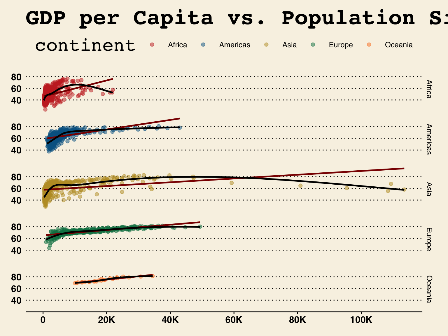 Sometimes it might be hard to read one panel plot, like the one we have just created in which it is not very easy to see the points of each continent. To make it easier to follow and to understand the information you are trying to depict, it would be more effective to present different categories of the same information in a clear set of multi-panel plots. This is easy to do by applying powerful faceting functions of the ggplot2: facet_wrap() and facet_grid().