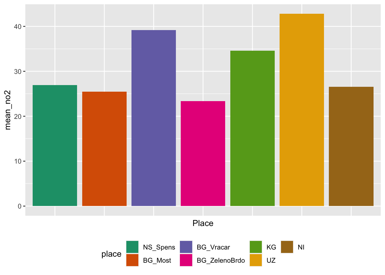 ggplot(aes(x = place, y = mean_no2, fill = place)) + # fill: colours each bar differently