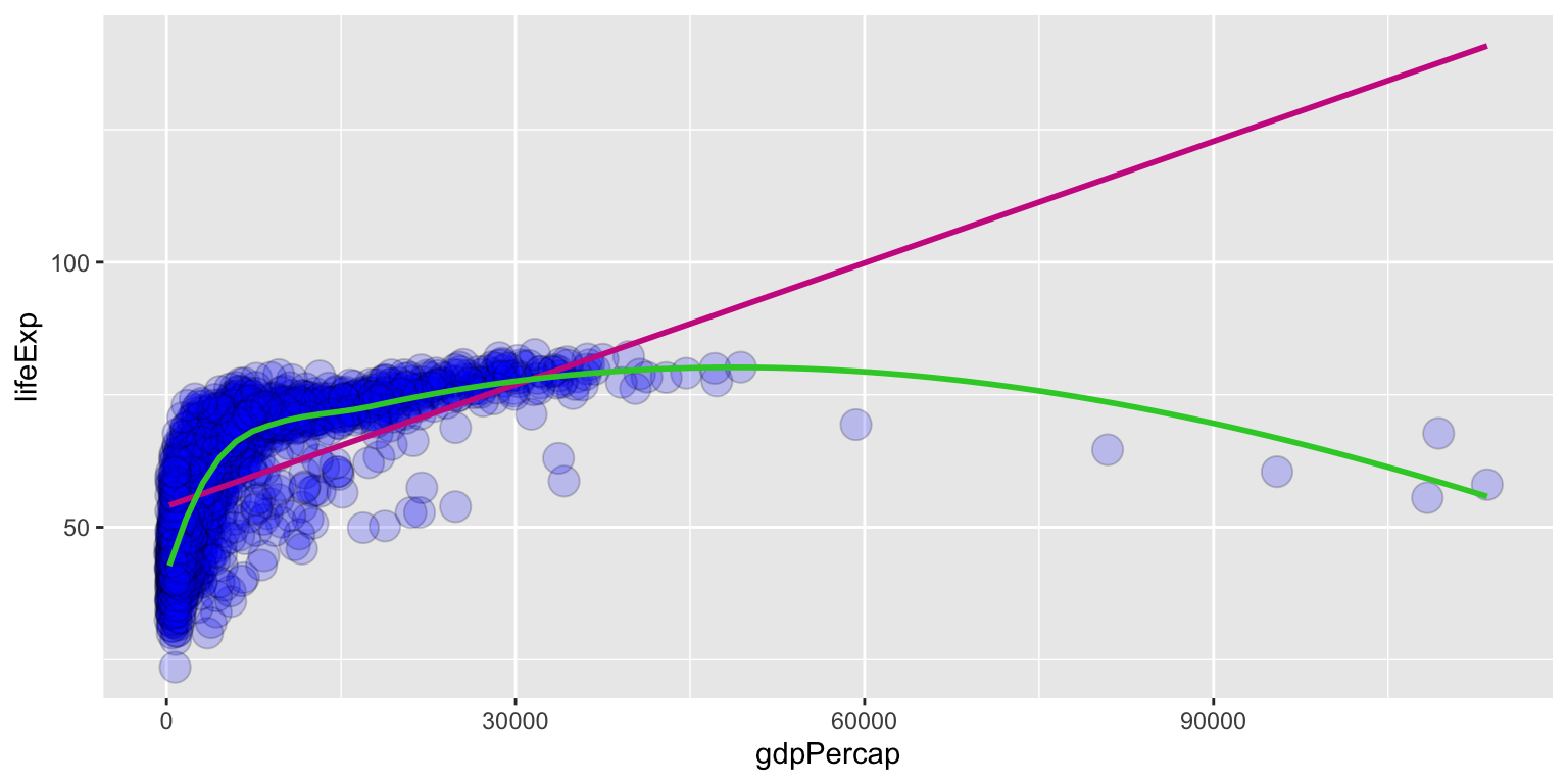We will add layers onto this scatterplot: liveExp vs gdpPercap. We want to superimpose regression line of the best fit and non-parametric loess line that depict a possible relationship between the two variables. That means we will have: