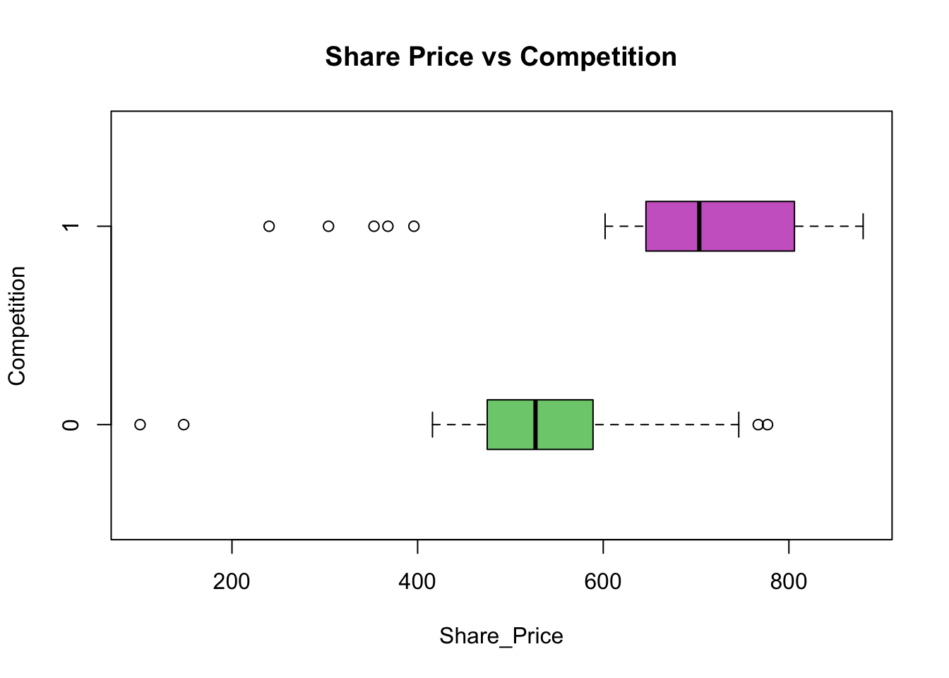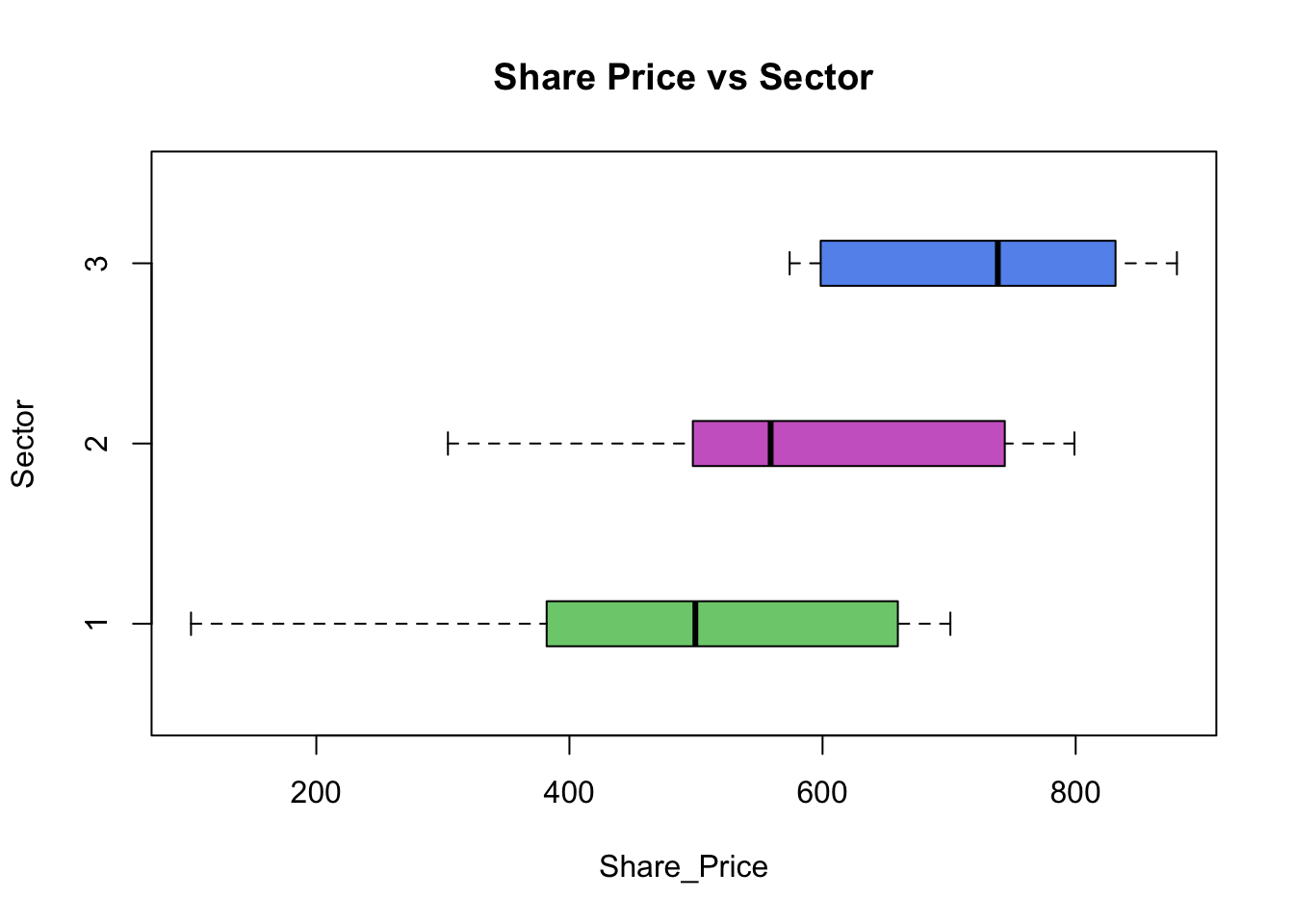 boxplot(Share_Price ~ Sector, data = companyd, boxwex = 0.25, main = "Share Price vs Sector", xlab ="Share_Price", ylab ="Sector", col=c("palegreen3", "orchid3", "cornflowerblue"), horizontal=T)