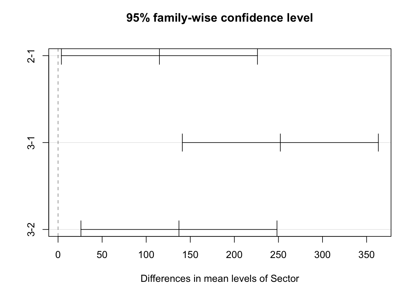 The decision rule: Differences between Sectors are significant at 5% level if the confidence interval around the estimation of the difference does not contain zero.