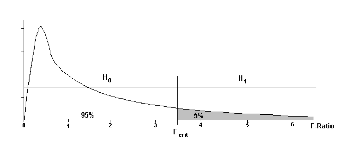 \(F_{crit}\) is the particular value of F that split the area under the distribution in the proportions 95% / 5%.