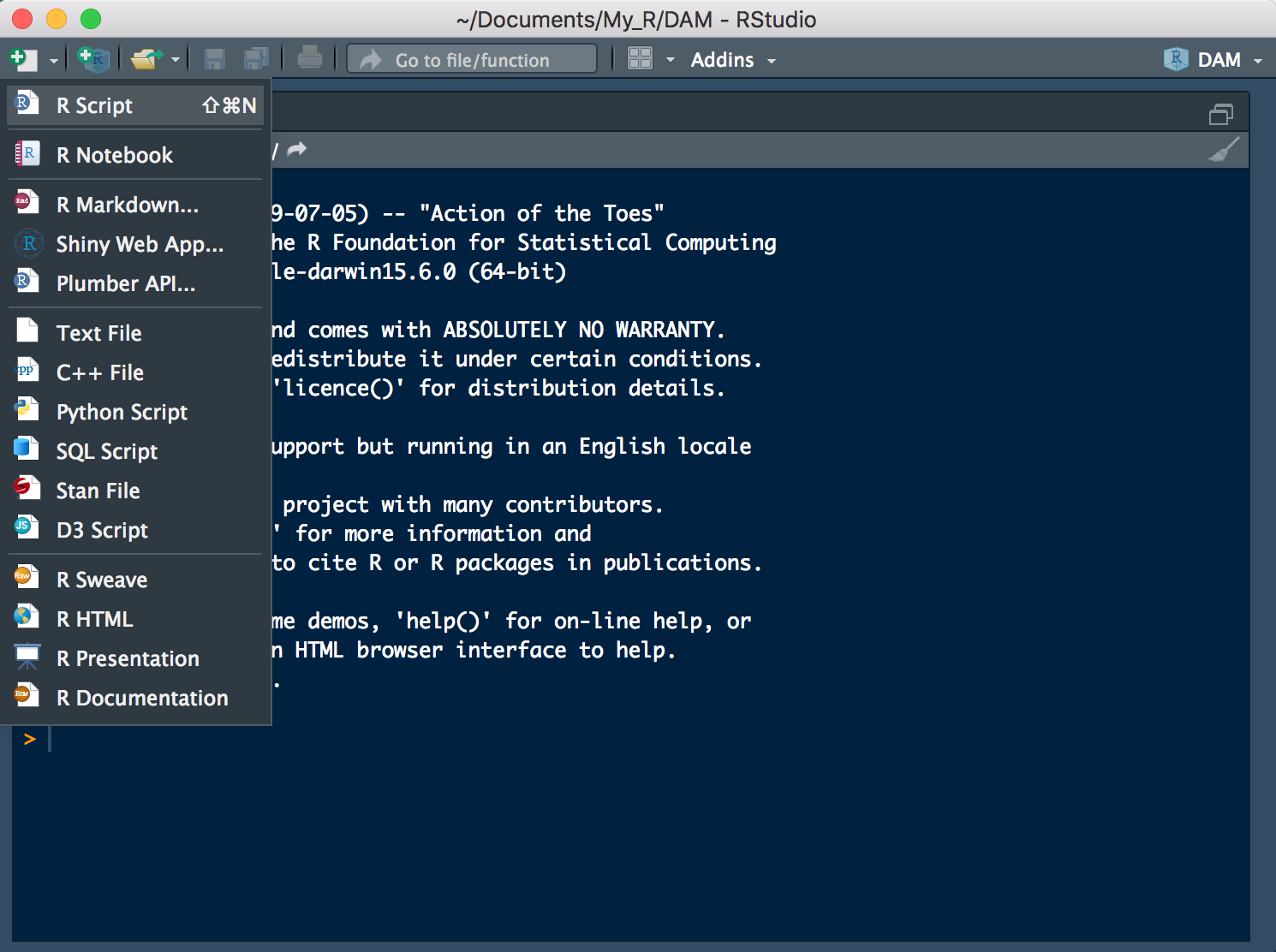 First, we need to access this data in R. We will start by creating a new project the ‘DAM’ within which we will keep all relevant scripts (.R), R-Markdown (.Rmd), data files and so on.
