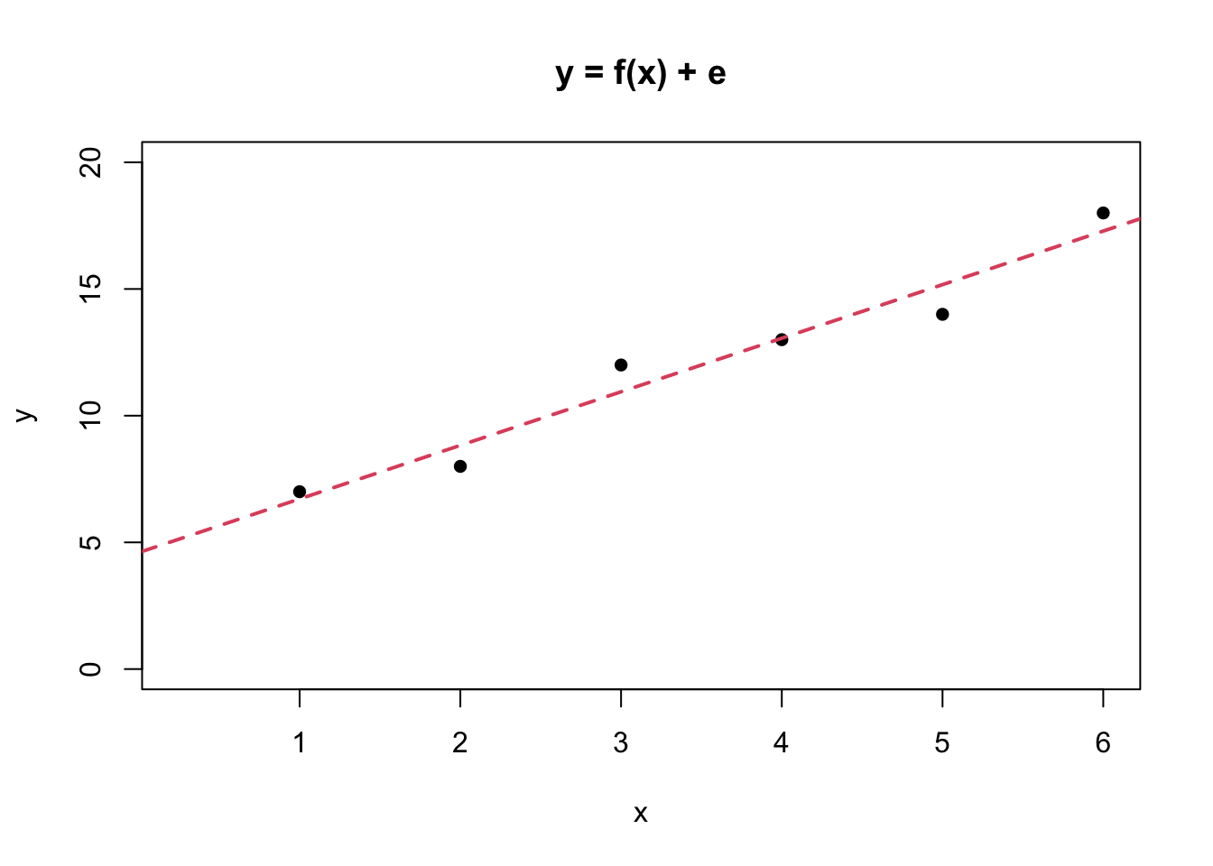 plot(x, y, pch = 16, main = "y = f(x) + e", xlim = c(0.25, 6), ylim = c(0, 20))
