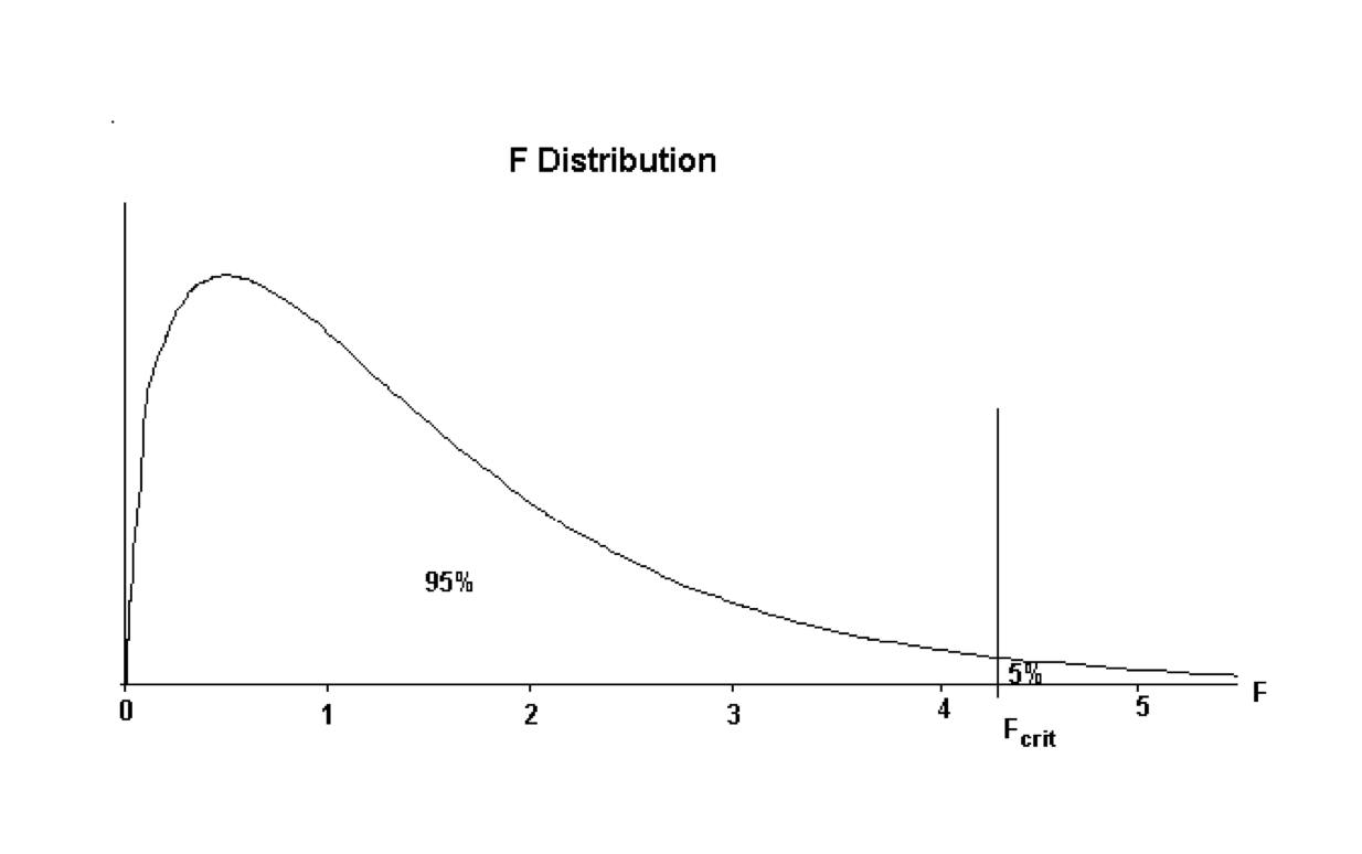 The value of \(F_{crit}\) is the value that divides the distribution with \(95\%\) of the area to the left of the \(F_{crit}\) ordinate, and \(5\%\) to the right. The accepted terminology is \(F_{crit}\) but this text will call this quantity \(F_{calc}\) to signify it is a quantity obtained from statistical tables.