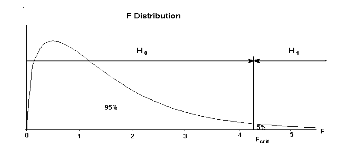 If \(F_{calc} < F_{crit}\) then favour \(H_0\), whilst if \(F_{calc} > F_{crit}\) then favour \(H_1\). This decision rule can be represented graphically as below:
