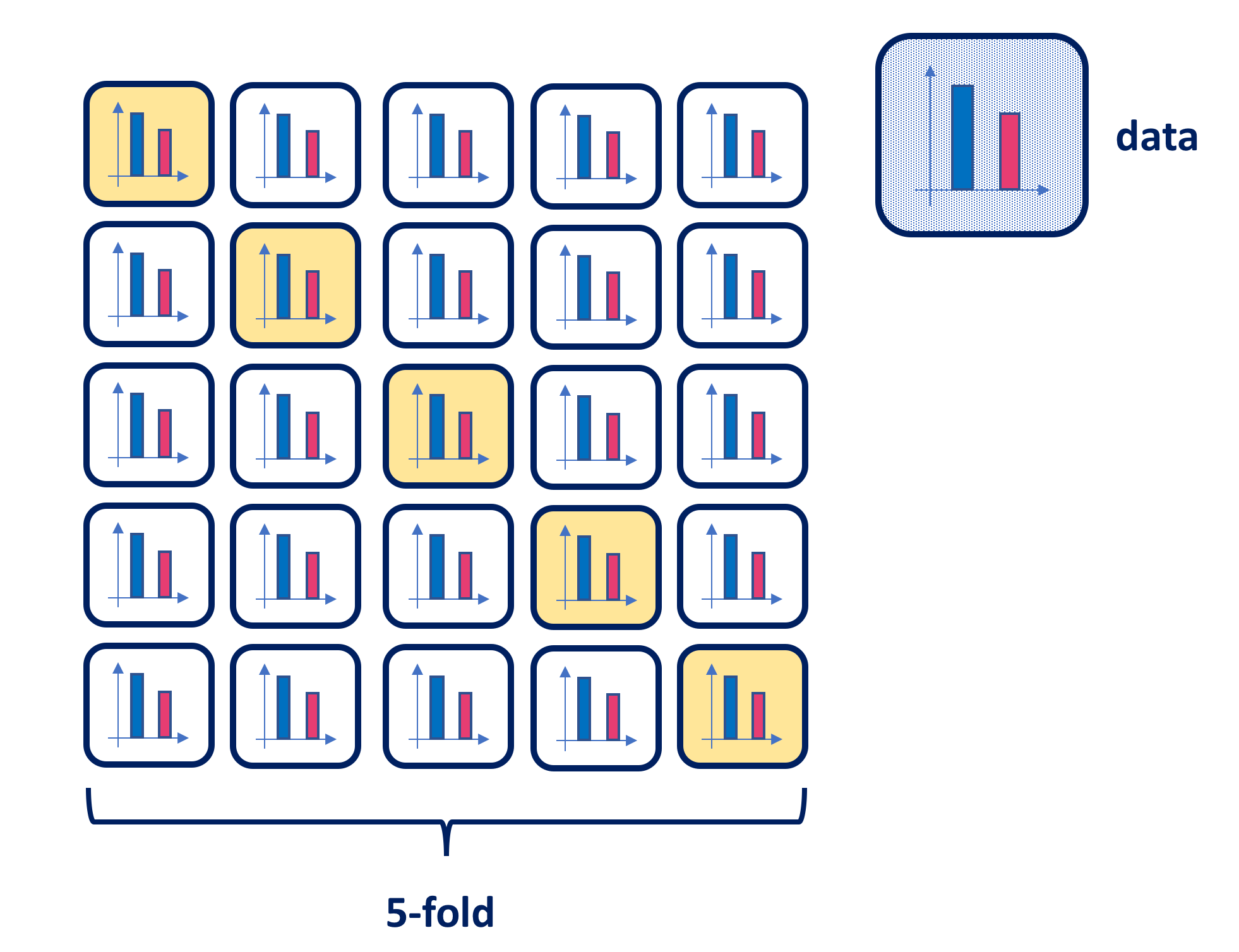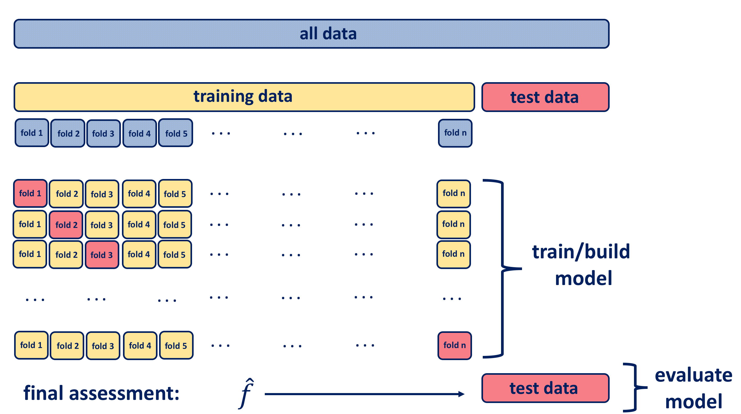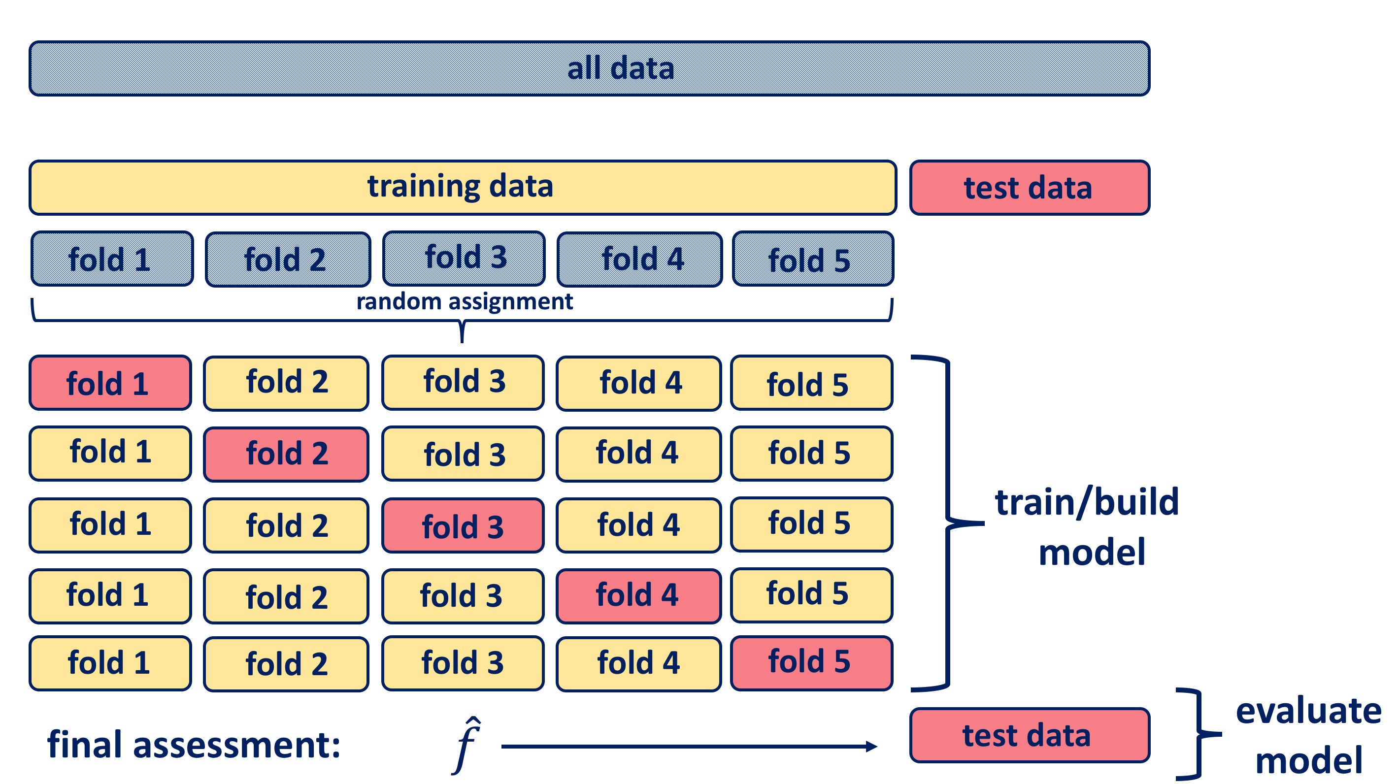 With cross-validation the test data is held out (approximately one fifth of data), and the remaining training data is randomly divided into \(k\) groups. Several different portions of this training data are used for validation, and the remaining part of the data is used for training as shown in the diagram below. Hence, a fold is treated as a validation set, and the method is fit on to the remaining \(k−1\) folds. The \(k\) resampled estimates of performance are summarized and used for testing and model building.