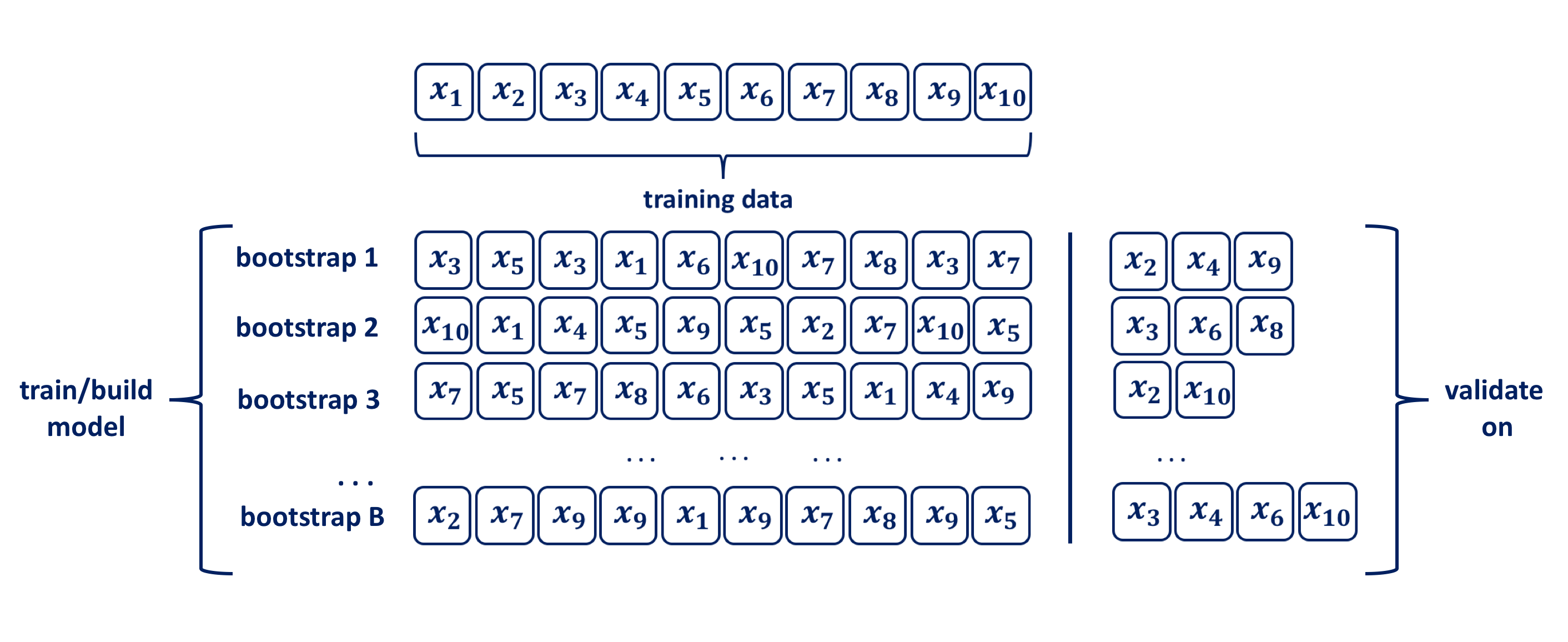 When allying the bootstrapping procedure for inferential purposes typical chose for \(B\) is in the range of a few hundreds to thousands. Efron and Tibshirani (p.52) indicate that \(B=50\) and even \(B=25\) is usually sufficient for bootstrap standard error estimates and point out that there are rare occasions for which more than \(B=200\) replications are needed for estimating a standard error. In the context of using bootstraping for validation purposes the size of \(B\) in the range of hundreds may be unacceptably high, and the validation process should be repeated for a specified number of folds \(k\), i.e. set \(B=k\). Hence, the bootstrap resampling with replacement procedure for ML from a data set of size \(n\) can be summarised as follows: