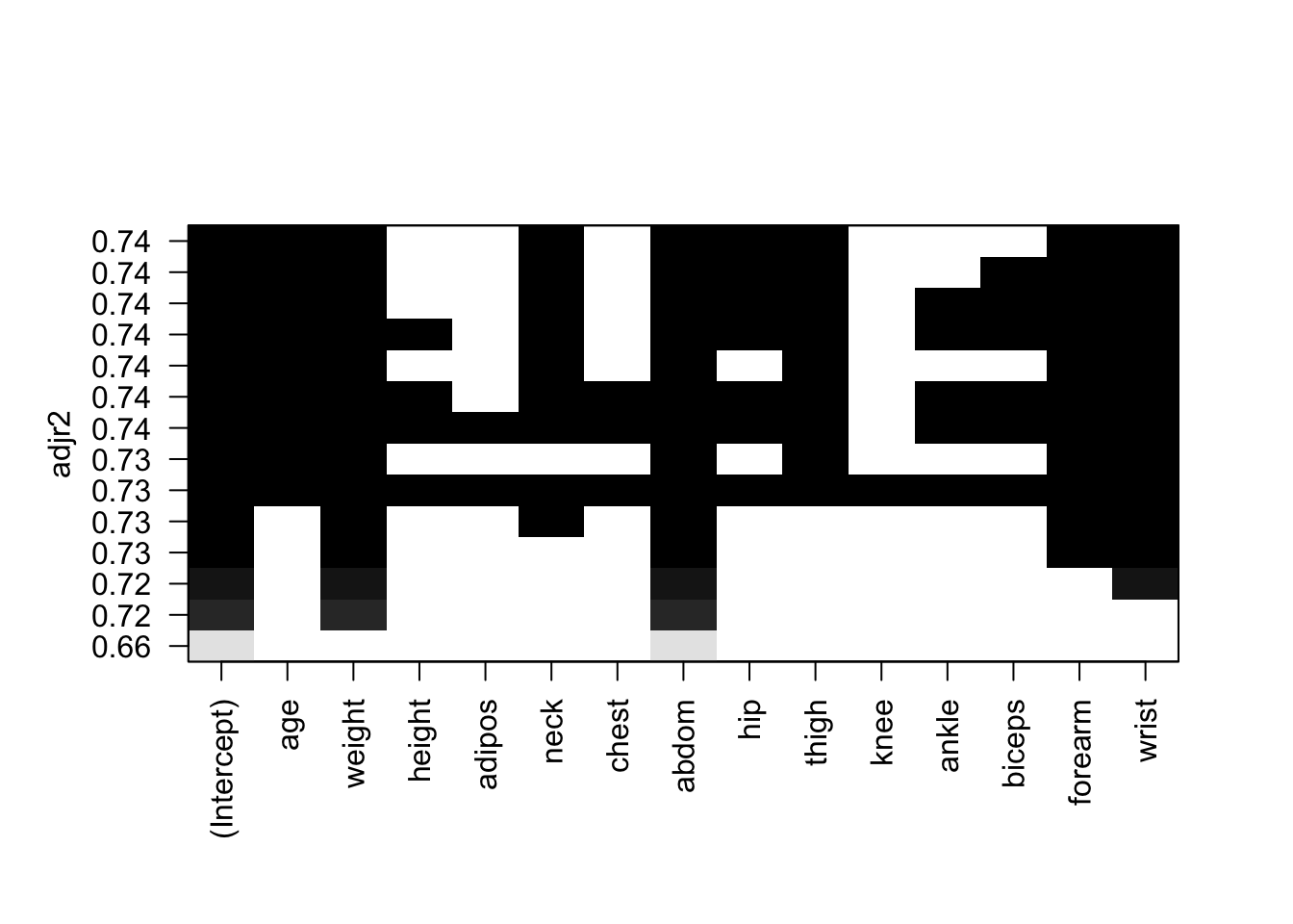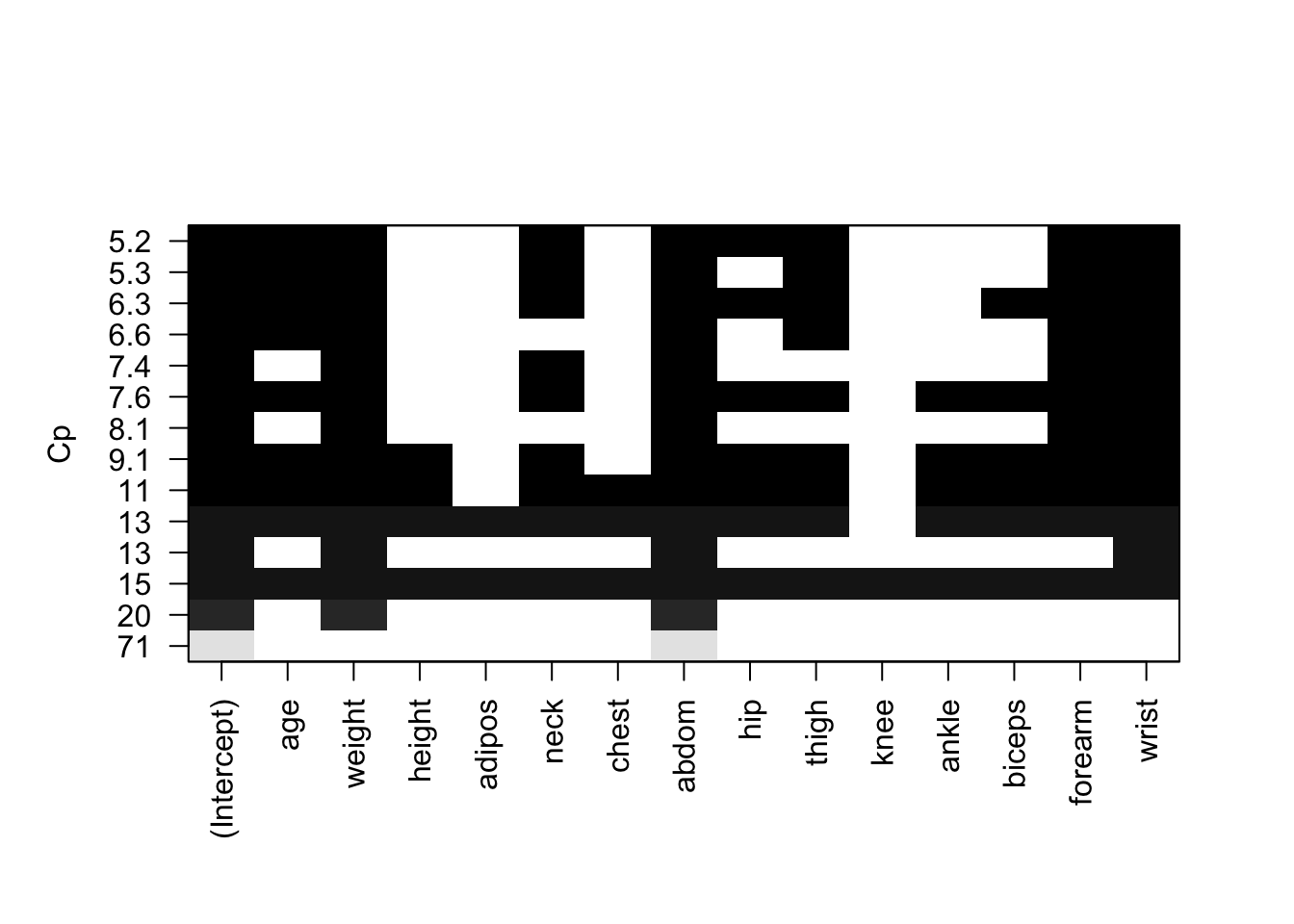 #breg <- regsubsets(brozek ~., data = bodyfat, nvmax = 4)