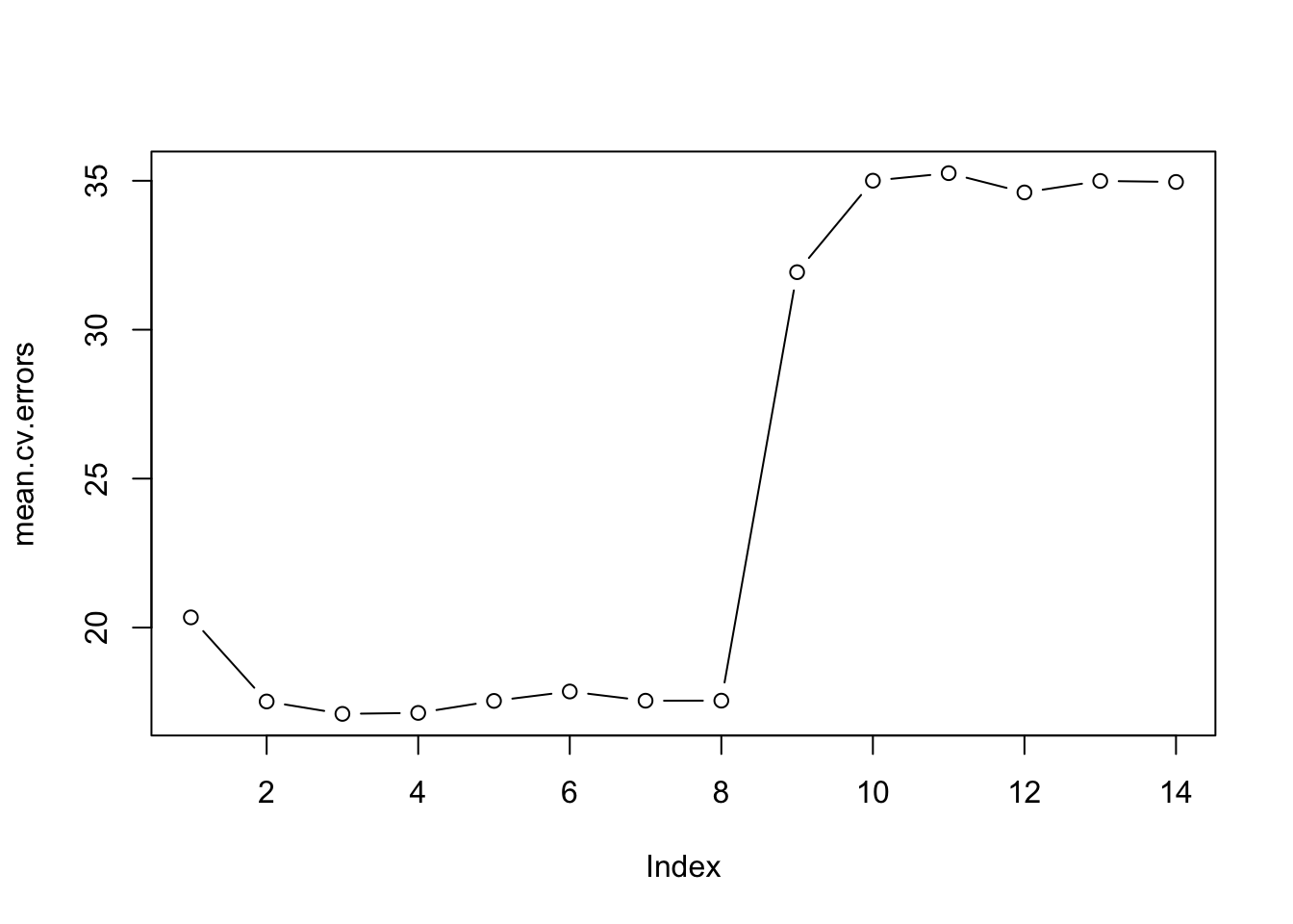 This creates a 10 \(\times\) 14 matrix, where the \((i, j)^{\text{th}}\) element represents the test MSE for the \(i^{\text{th}}\) cross-validation fold for the best \(j\)-variable model. We use apply() to average over the columns of this matrix in order to obtain a vector for which the \(j^{\text{th}}\) element is the cross-validation error for the \(j\)-variable model.