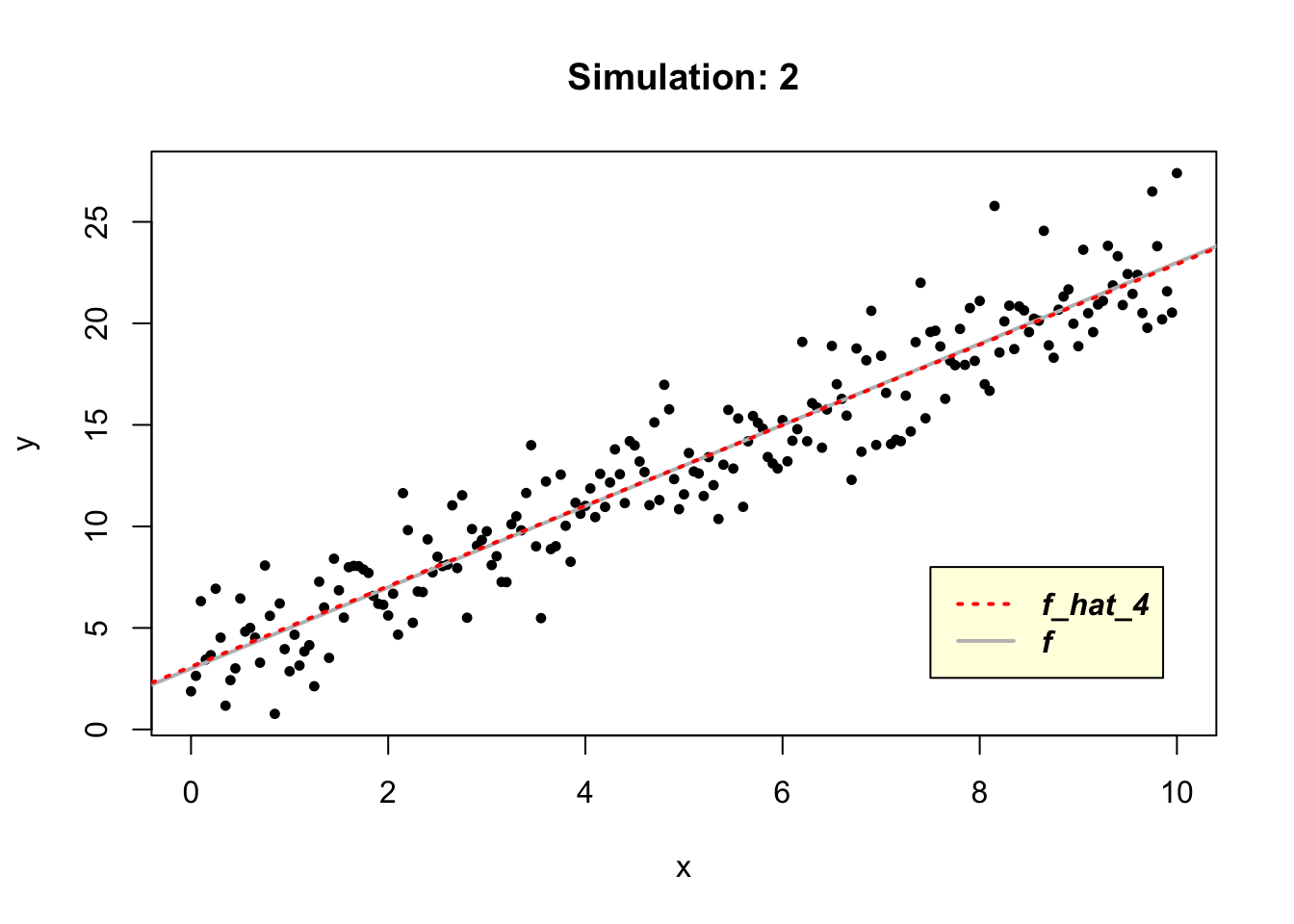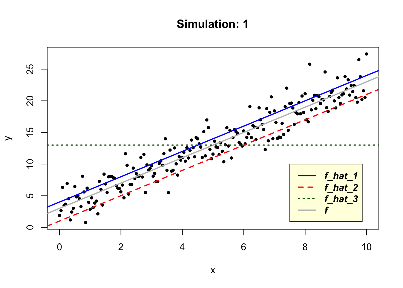 \(\hat{f}_1\) has a positive bias because it is overestimating data points more often than it is underestimating, but as it does it so consistently in comparison to \(f\) that produces variance of zero. In contrast \(\hat{f}_2\) has a negative bias as it is underestimating simulated data, but nonetheless it also does it consistently, resulting in zero variance with \(f\).