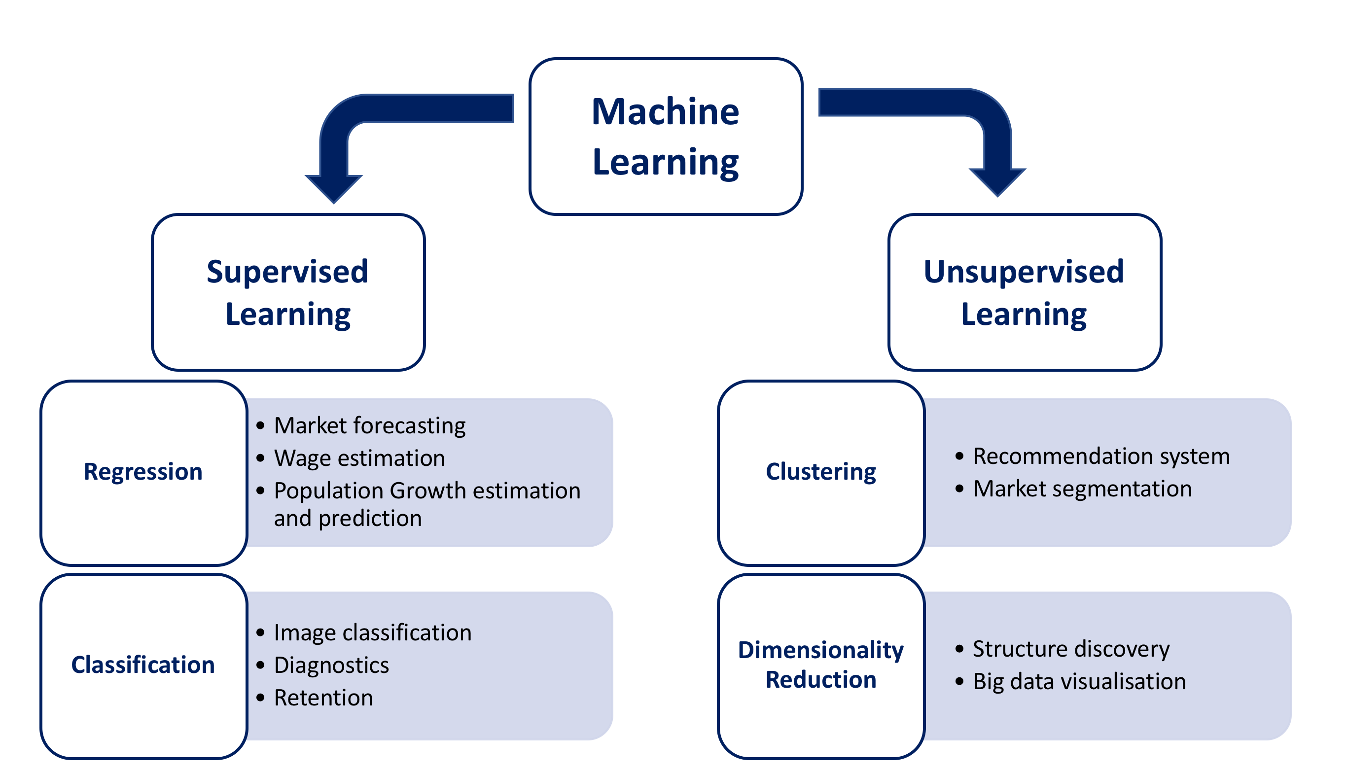 We will touch upon a few of the most popular ML algorithms from a vast set of its algorithmic tools for understanding data. These tools are broadly classified as supervised or unsupervised. In general, supervised learning involves building a statistical model for estimating or predicting an output based on one or more inputs. There are many examples of their application in pharma and medicine, such as disease identification/diagnosis and personalised treatments, or pricing in business to name a few. With unsupervised learning, there are inputs but no supervising output; nevertheless, we can learn relationships and structure from such data. One of the most popular examples is a recommender system as a reflection of our consumer behaviour. Other examples can be found in biological genomic studies, market research, security, with the most used example being anomaly detection of malicious activity in an organization’s network etc.